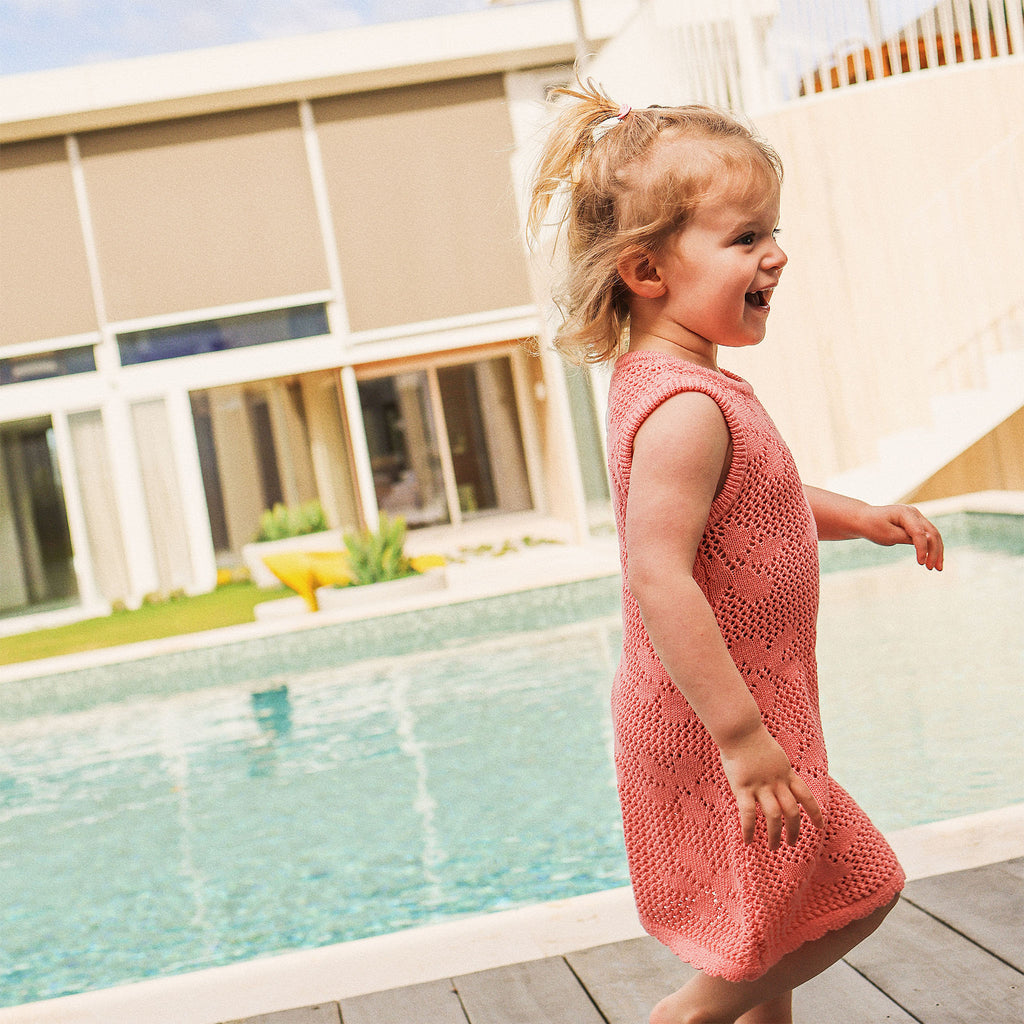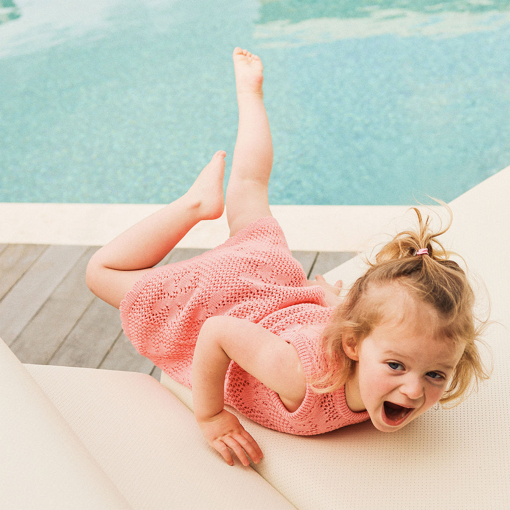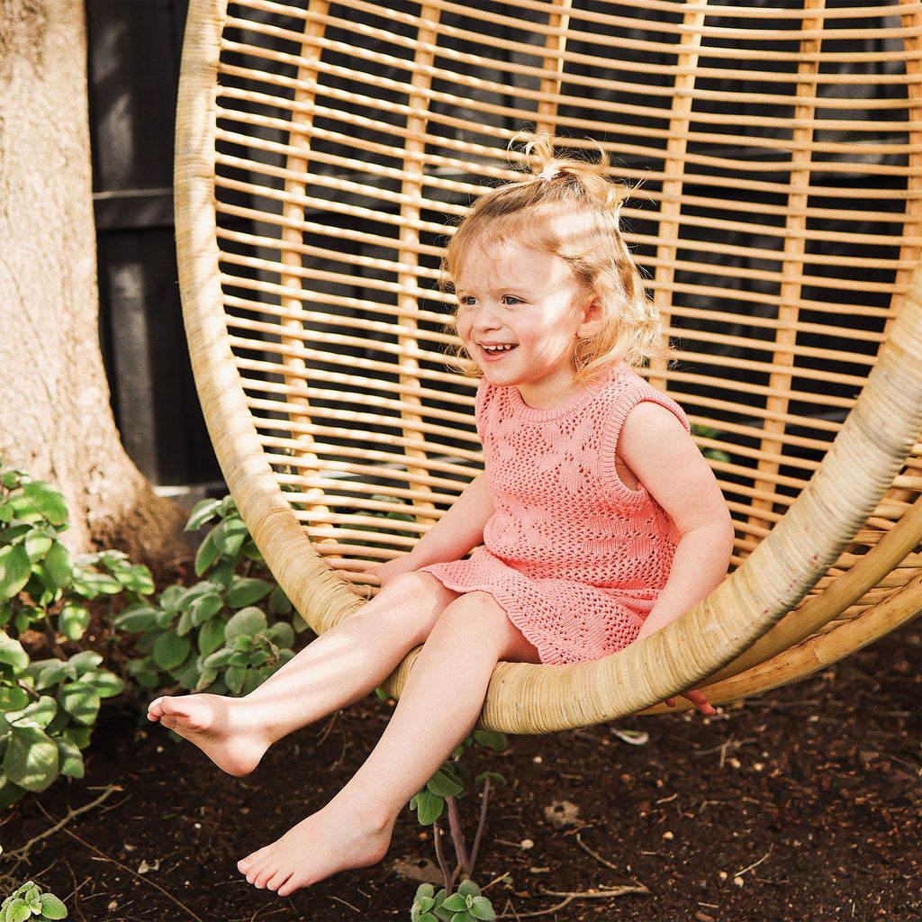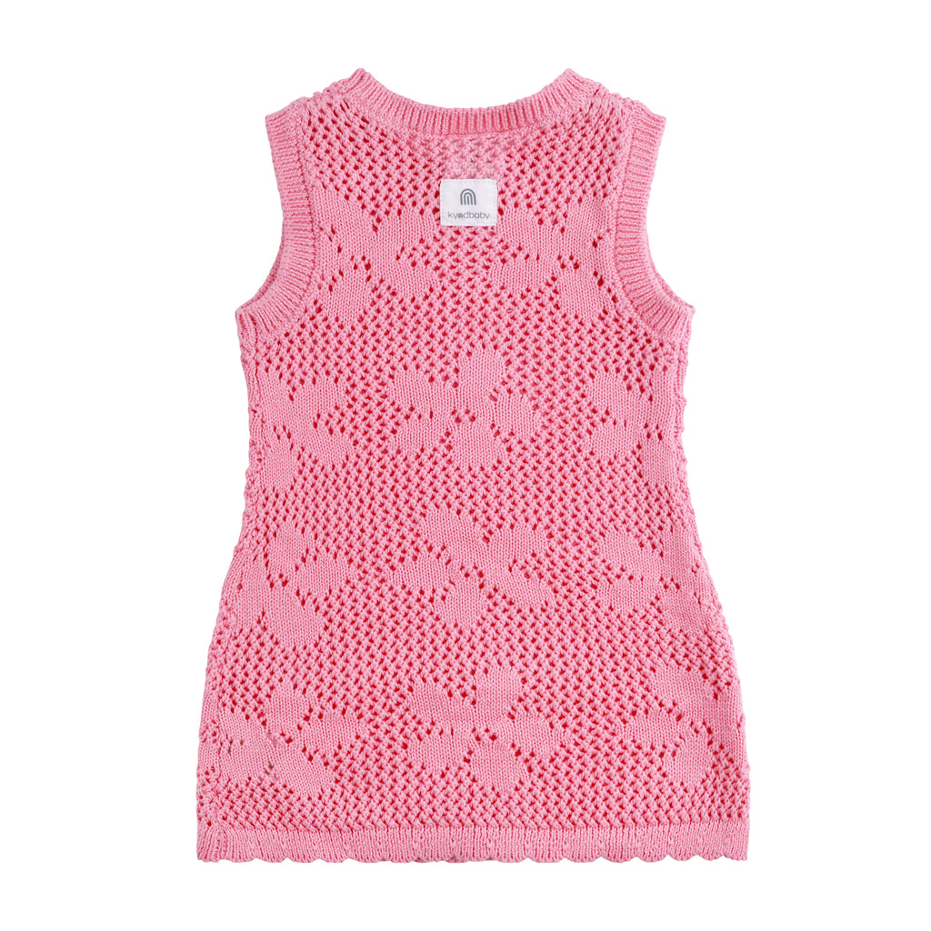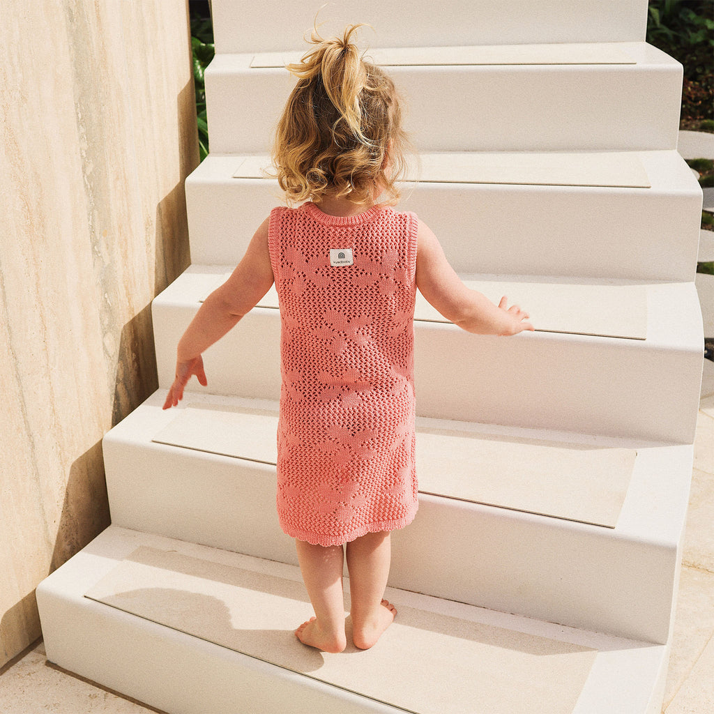 Our Crocheted Sleeveless Dress is made from 100% organic cotton with an airy, handcrafted feel. Featuring delicate crochet flower detailing and a soft pink hue, this elevated piece is perfect for warm days, special outings, and twirling in the sun. Lightweight, breathable, and designed for all-day comfort.