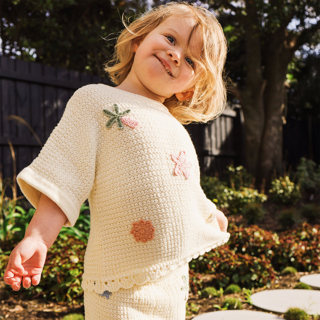 • Crochet mesh knit with summer-inspired crochet patch motifs