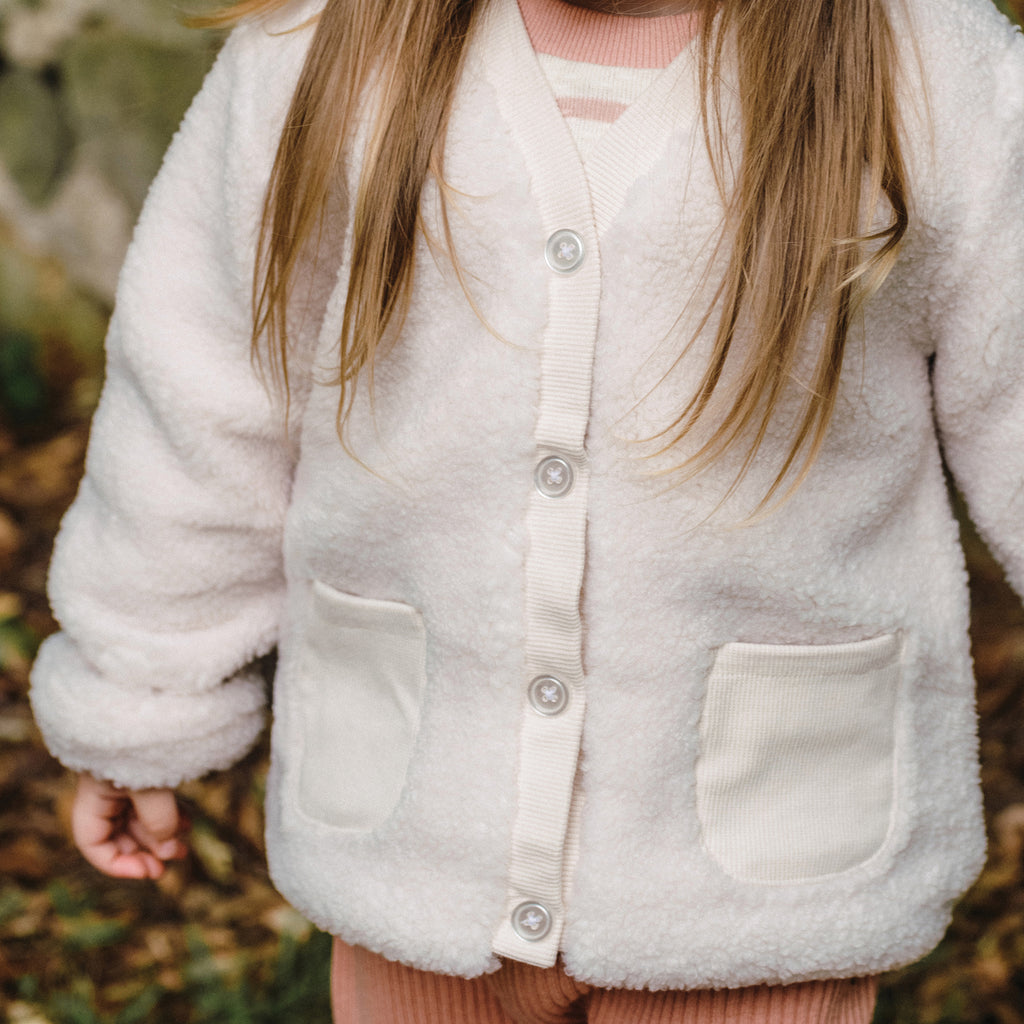 Keep little ones cosy with the Kynd Baby Sherpa Jacket in Ivory. Crafted from soft Sherpa with a cotton jersey lining, this jacket features a button-through front rib placket, front patch pockets, and side pockets for tiny treasures. Perfect for layering on cooler days, it’s lightweight, practical, and machine washable for fuss-free care. Designed in Australia, this versatile jacket is suitable from birth and ideal for everyday adventures.