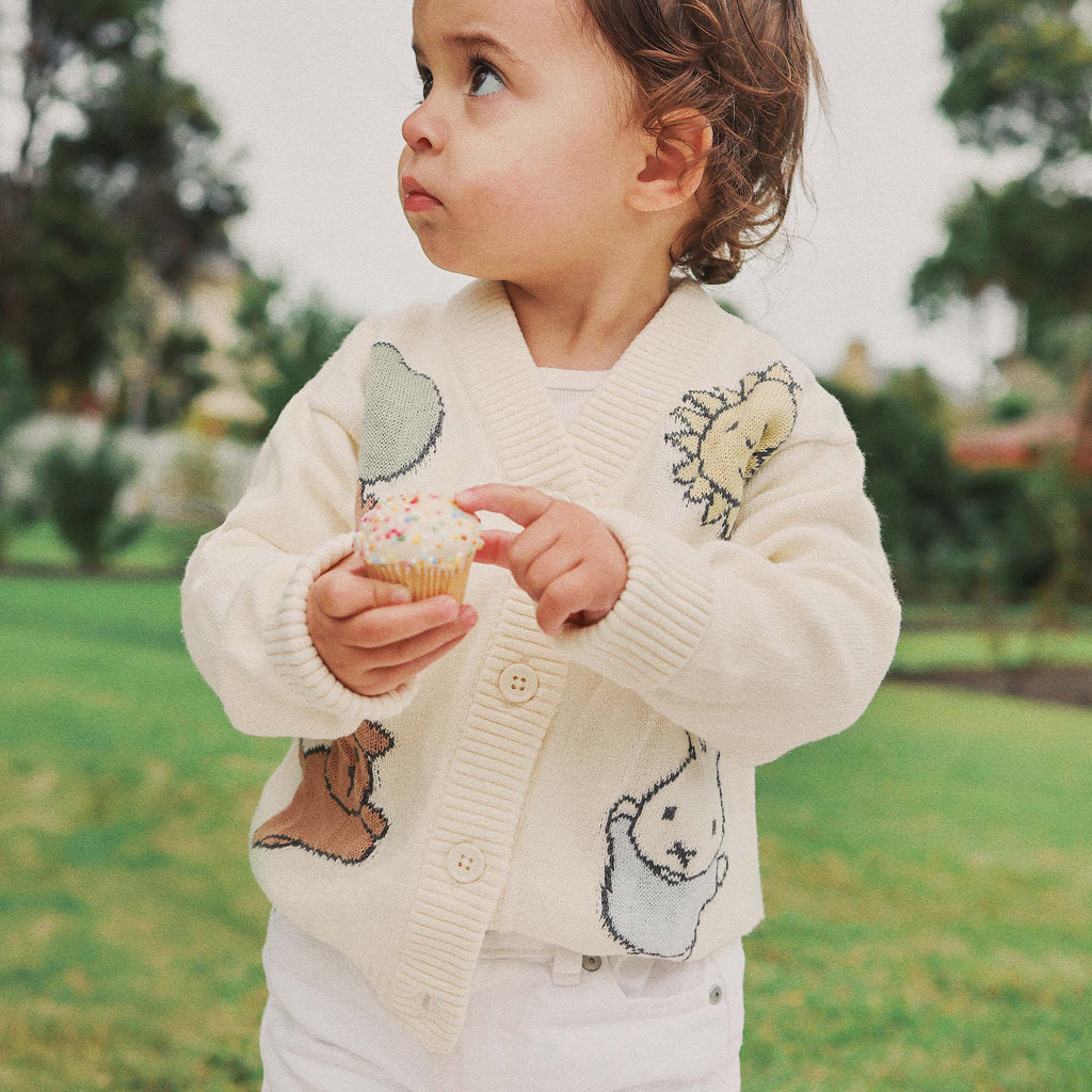 Playfully detailed with Miffy, Snuffy, a smiling sun and a sweet tree the limited edition Miffy Knit Cardigan in Pristine is crafted from soft organic cotton yarn for year-round comfort. A true keepsake that’s wearable too.