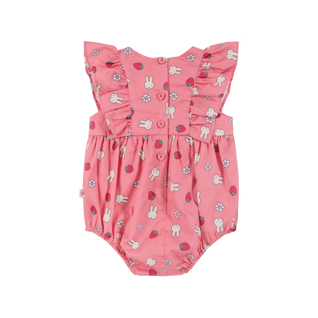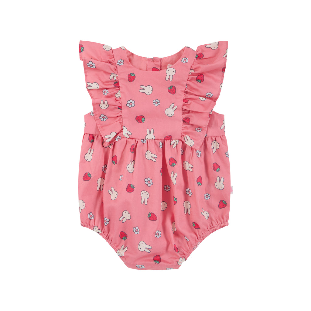 The adorable Miffy Yoke Romper in Strawberry is crafted in cotton sateen and features an all-over Miffy print with a gathered frills at shoulder and romper bottom. A go-to for warmer days and picture-perfect moments. Can be worn as is or layered for cooler days.