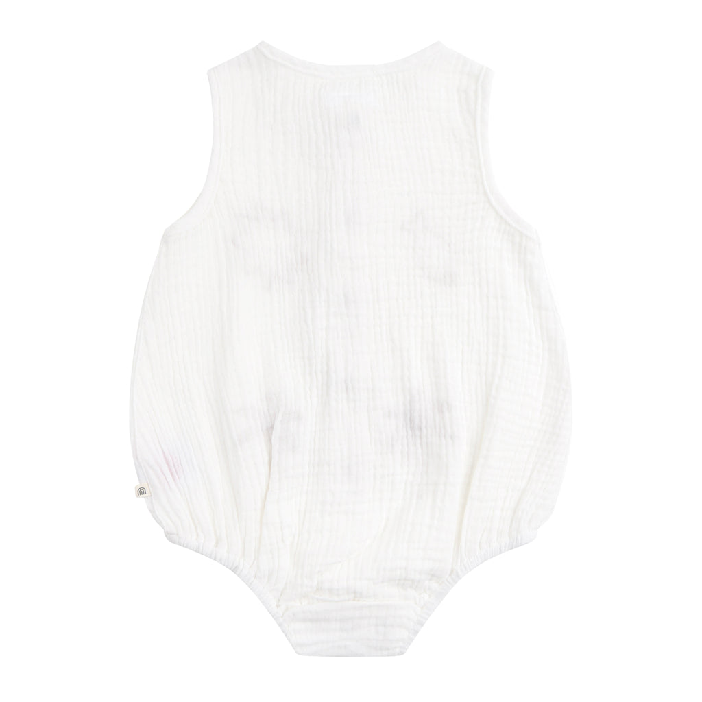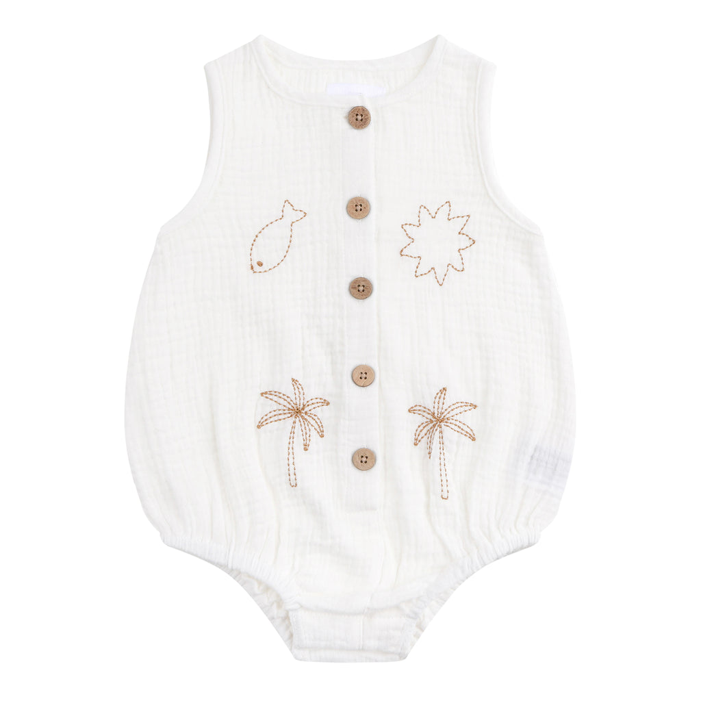 Our Sleeveless Woven Shortall is made from soft, breathable organic cotton muslin - light and airy for warm days. Earthy-toned coastal inspired embroidery adds a playful touch, while snaps at the crotch make changing quick and easy. The perfect choice for summer adventures!
