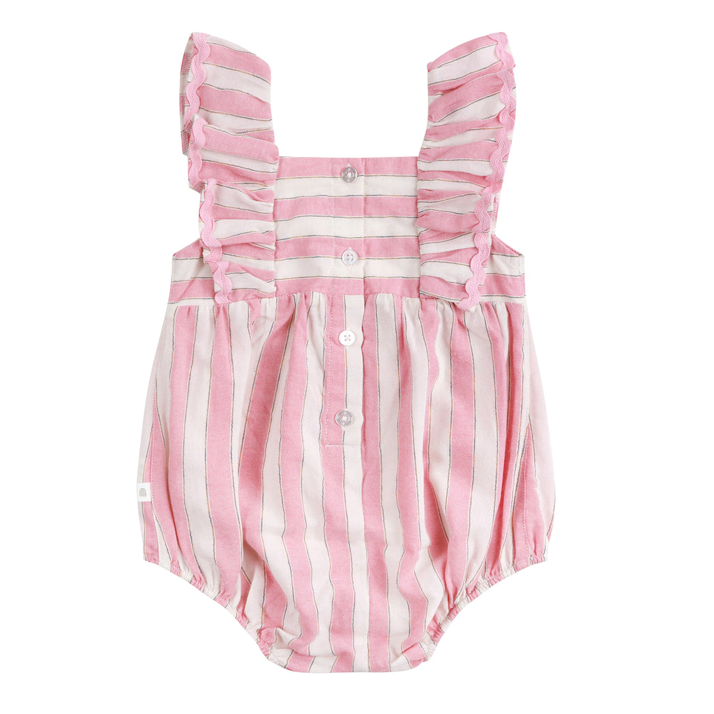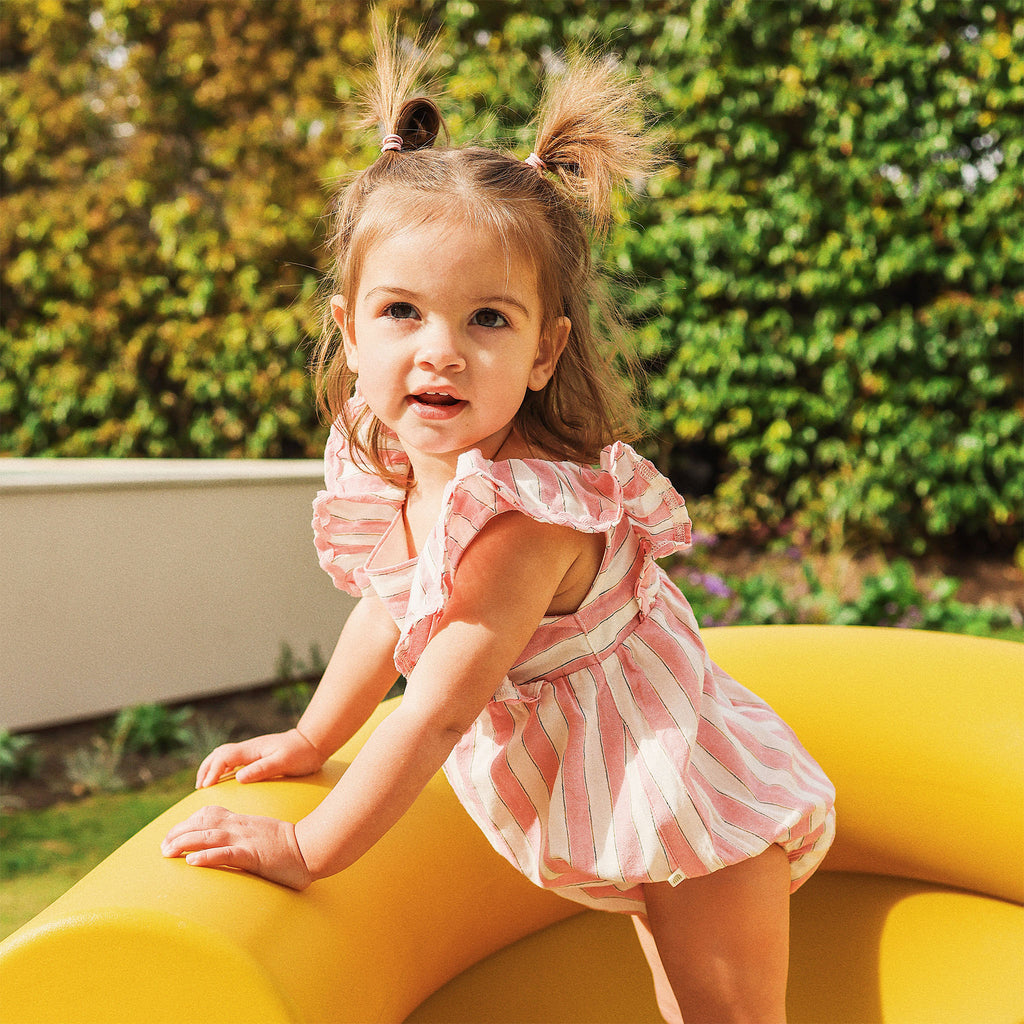 Our playful Frilled Woven Romper features a playful pink stripe pattern and sweet shoulder frills. Made from soft, breathable cotton, it’s light and airy for sunny days and summer adventures. Perfect for keeping your little one cool and comfortable while adding a splash of joyful colour to their wardrobe!
