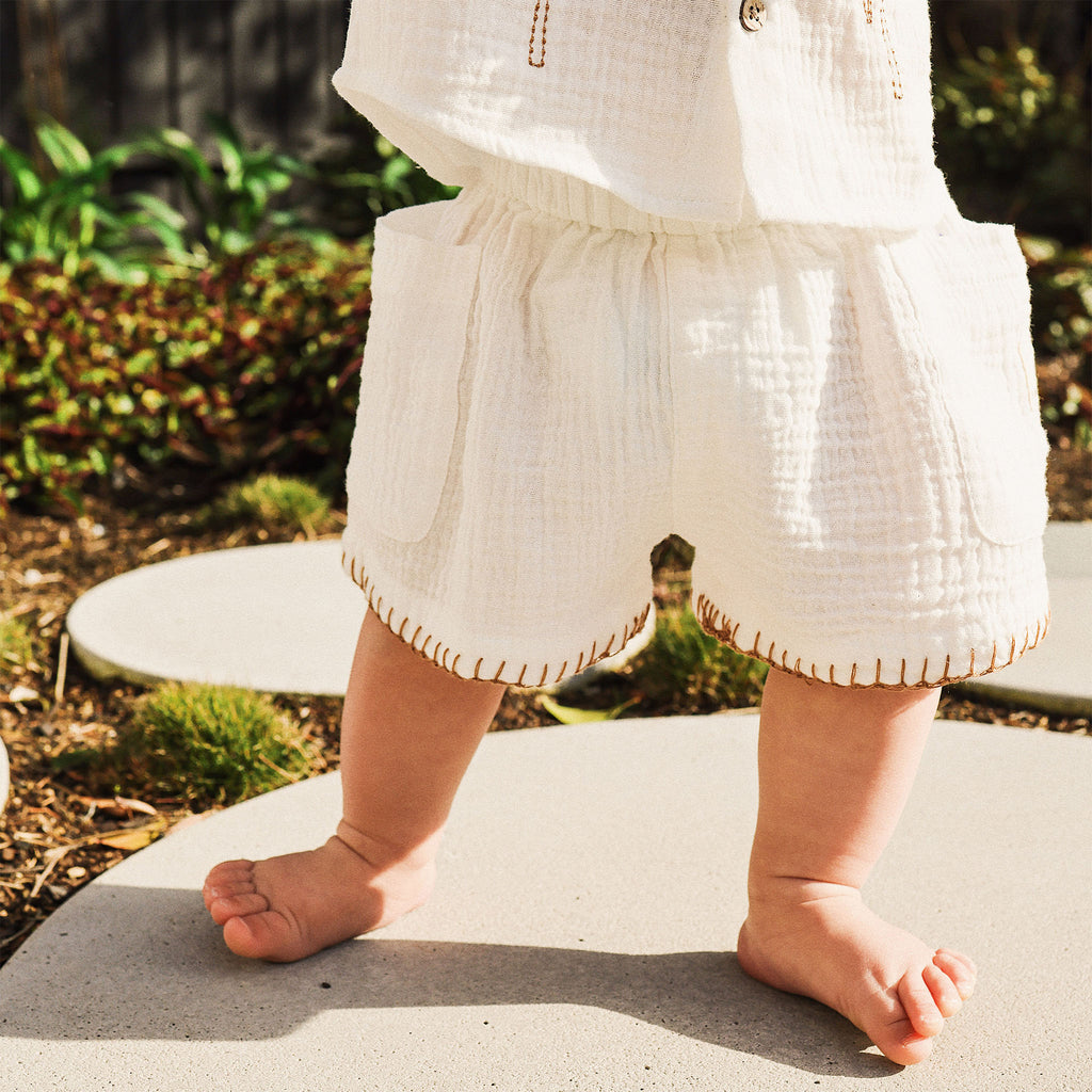 Crafted from soft organic cotton muslin, our breathable Woven Shorts are lightweight and gentle on skin. With handy side pockets and an adjustable drawcord, these easy-care shorts offer flexible comfort and breezy freedom for all-day adventures!